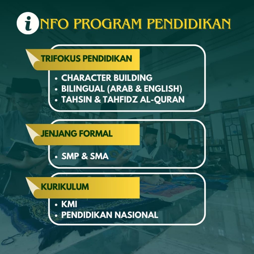 📌 Motto Pendidikan Pesantren Kami percaya bahwa pendidikan yang benar akan menghasilkan pribadi yang: Berbudi tinggi Berbadan sehat Berpengetahuan luas – Berfikiran luas 📌 Kegiatan Santri Kegiatan di pondok kami memadukan pendidikan agama dan pengembangan keterampilan. Beberapa kegiatan menarik yang dapat diikuti santri meliputi: Hafalan Al-Qur’an (sesuai kemampuan santri) Tasmi’, Semaan Pelajaran Kurikulum KMI Gontor dan Nasional Penyampaian kosakata baru (Bahasa Arab & Inggris) setiap pagi Tadabbur Alam Manasik Haji Latihan Pengurusan Jenazah Pelatihan Imamah (Imam, Muadzin, Khotib) Kajian Hadist, Tafsir, Sejarah Islam Pembelajaran Kitab Kuning Pentas Seni Belajar Wirausaha Pidato Olahraga – Dan banyak kegiatan lainnya untuk menambah wawasan serta keterampilan santri. 📌 Fasilitas yang Tersedia Kami menyediakan fasilitas lengkap yang mendukung kenyamanan serta kegiatan belajar mengajar santri, di antaranya: Asrama Putra dan Putri terpisah Makan 3x sehari Ruang Multimedia Perpustakaan Masjid untuk ibadah dan kegiatan keagamaan Kelas dengan fasilitas yang memadai Lapangan olahraga untuk menjaga kebugaran tubuh Sanggar seni untuk menyalurkan bakat seni santri Ruang kesehatan dengan fasilitas medis dasar Kantin dengan berbagai makanan dan minuman Lab Bahasa untuk latihan penguasaan bahasa asing – Dan masih banyak fasilitas lainnya untuk mendukung perkembangan santri. 📌 Ekstrakurikuler Santri di Pondok Pesantren Modern Hasan Munahir dapat mengikuti berbagai kegiatan ekstrakurikuler menarik dan bermanfaat, seperti: Teknologi Informasi dan Komunikasi (TIK) Hijamah (Perawatan Kesehatan Tradisional) Hadroh Kaligrafi Qiroah Pramuka Olahraga Tata Boga Dan banyak kegiatan menarik lainnya yang akan mengembangkan bakat dan minat santri.