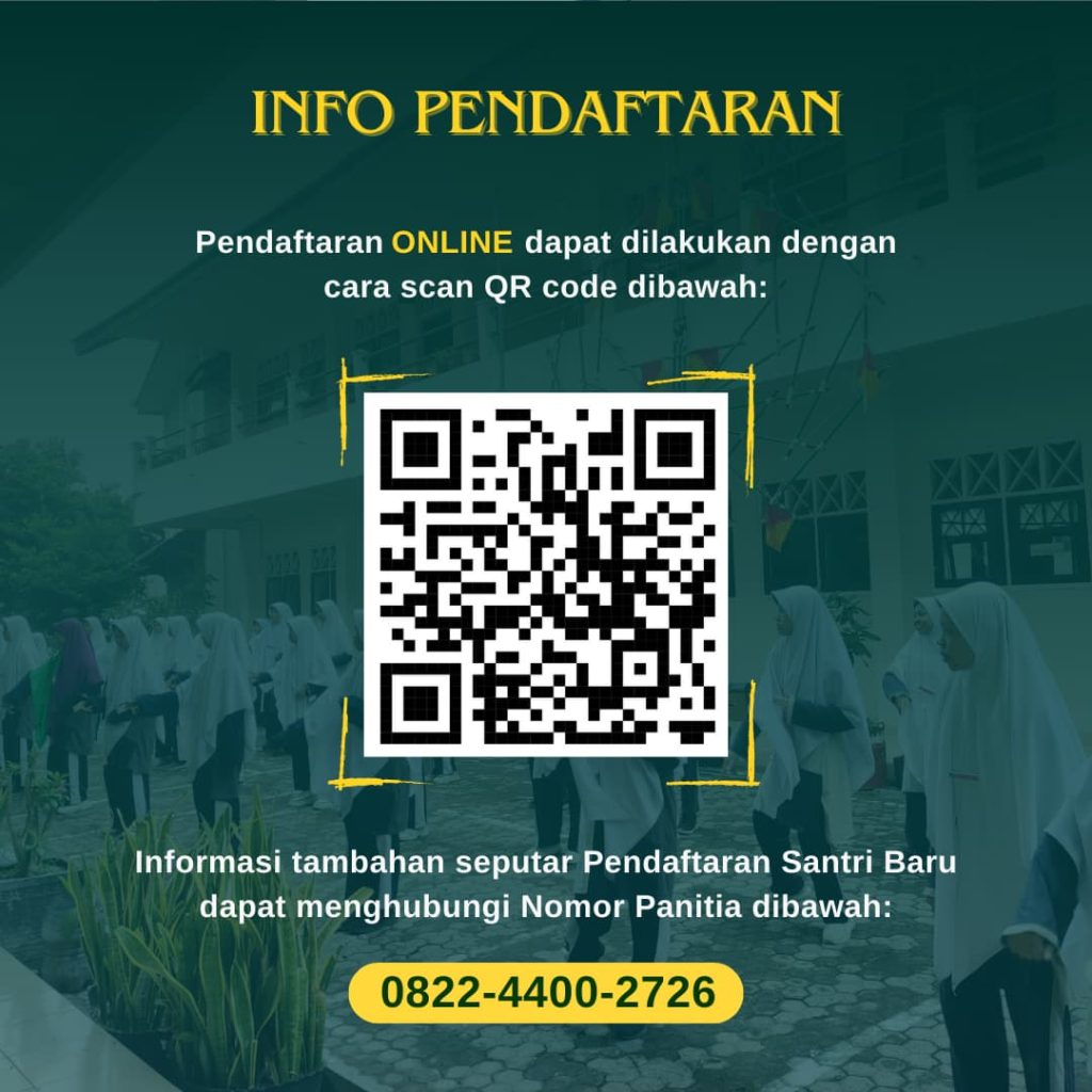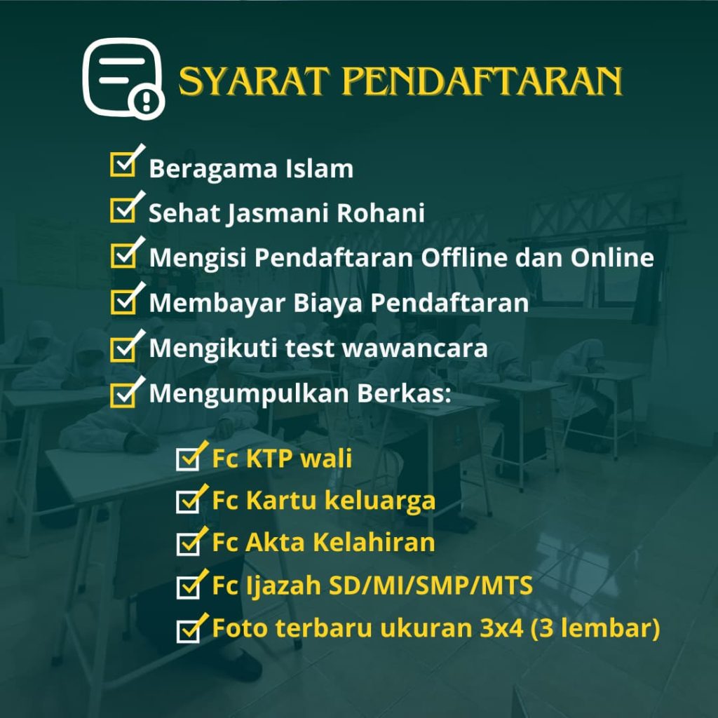 📌 Persyaratan Pendaftaran Pastikan Anda melengkapi berkas-berkas berikut: Fotokopi ijazah terakhir yang dilegalisir (2 lembar) (Bisa menyusul) Pasfoto berwarna: Putra: Berkemeja putih, latar belakang merah ukuran 3×4 (3 lembar) Putri: Berjilbab putih, latar belakang biru ukuran 3×4 (3 lembar) Fotokopi Akta Kelahiran (2 lembar) Fotokopi Kartu Keluarga (2 lembar) Fotokopi KTP orang tua/wali (2 lembar) – Fotokopi KIS (jika ada) Mari bergabung bersama kami, dan jadilah bagian dari perjalanan pendidikan yang membentuk generasi yang tidak hanya cerdas, tetapi juga berakhlak mulia dan siap menghadapi tantangan masa depan! Wassalaamu’alaikum Warahmatullahi Wabarakaatuh