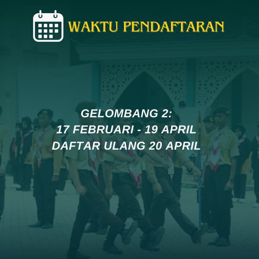 📌 Jadwal Pendaftaran Gelombang 1 : 1 Januari – 15 Februari (Daftar Ulang 16 Februari) Gelombang 2 : 17 Februari – 19 April (Daftar Ulang 20 April)